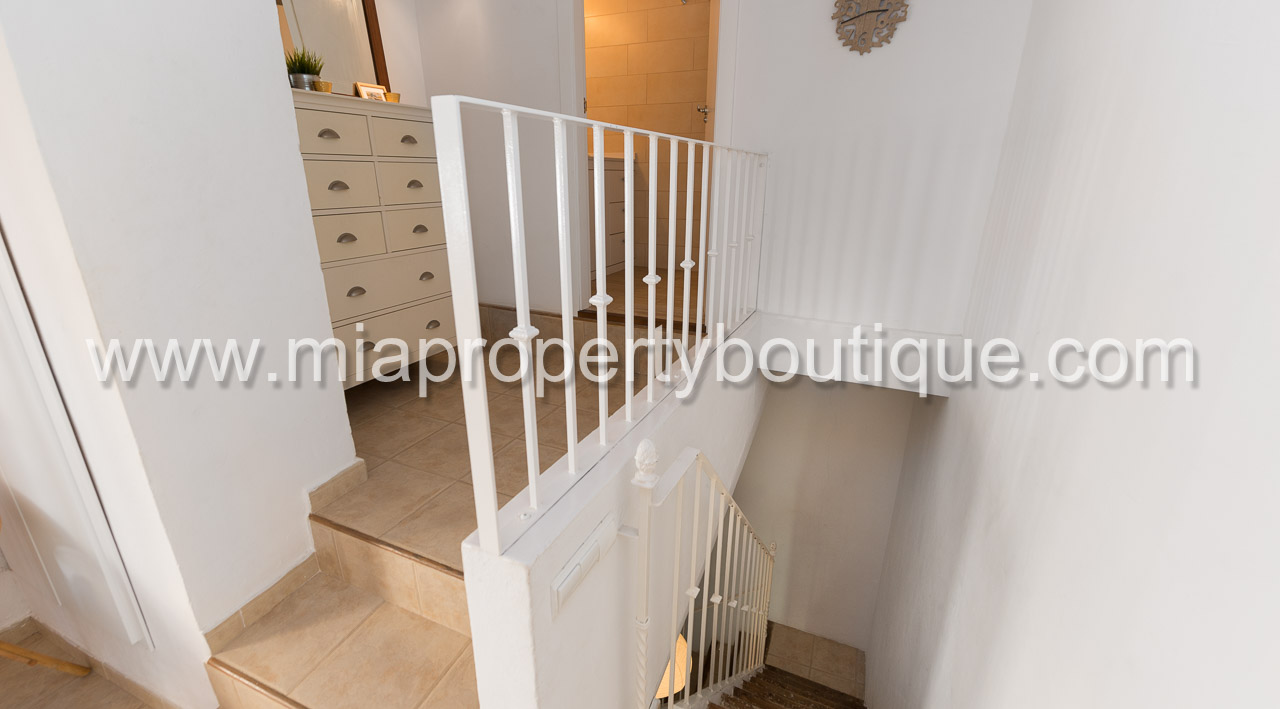 Esta hermosa casa se distribuye en tres niveles, en la planta baja nos encontramos con la cocina en estilo abierto con el salón, la casa es pequeña, sin embargo debido a sus techos altos con vigas, la casa da una sensación de espacio y placer; Hay un balcón con vistas al pasaje de al lado, donde se pueden apreciar otras casas similares. En la primera planta hay un dormitorio de tamaño doble con armarios empotrados y un baño ademas de otra terraza que está afuera de las puertas de madera dobles que conduce al aclamado solarium donde estará el sol y las vistas esperando.