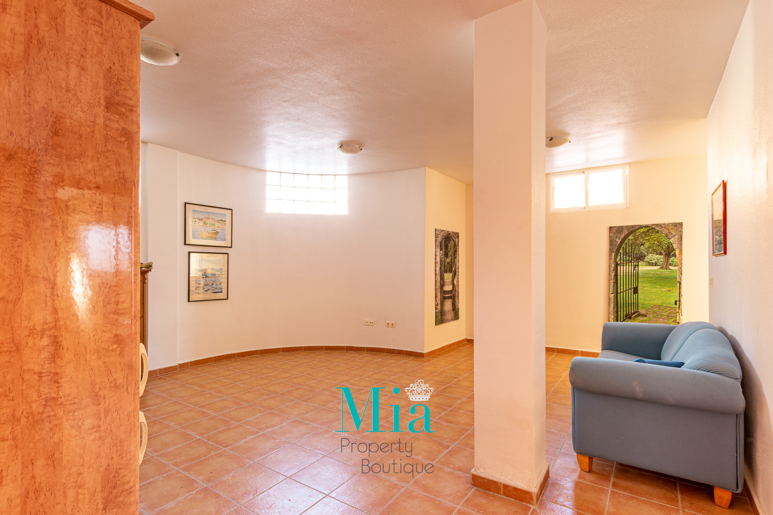 La planta baja tiene garaje para 2 coches y mucho espacio de almacenamiento. También hay un apartamento independiente en esta planta, completo con cocina y sala de estar, 2 habitaciones dobles y un baño con ducha, todas las habitaciones tienen ventanas y hay una entrada privada para este apartamento. Está equipado con aire acondicionado.