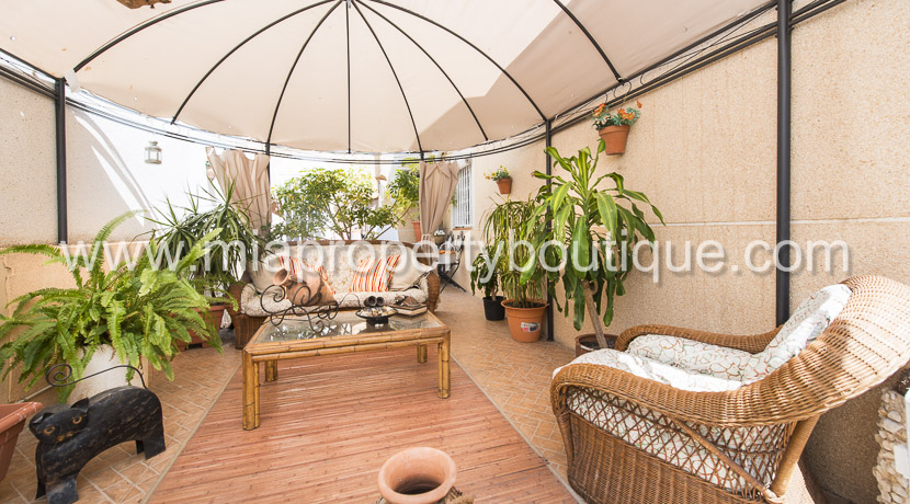 En la parte exterior de la casa esta el patio/terraza, con un canapé protegiendo del sol, hay espacio para un piscina o garaje si deseas. En la tercera planta hay espacio para otra terraza mas o una ampliación.