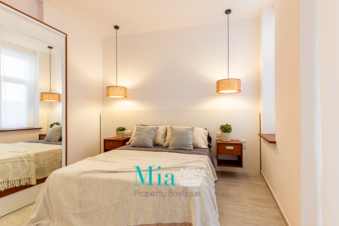 Spacious,bright and airy with modern touches meeting the vintage style of the place. The apartment features one double bedroom with fitted wardrobes and access to the back terrace, the second bedroom is also double and can have a bed or a desk, with access to the back terrace and the toilet. There is an elegant family bathroom with shower and glass panels. The Kitchen dinner has a wooden cupboard kitchen, with a fridge, cooker and over. Spacious over looking at the terrace, dinner and lounge.