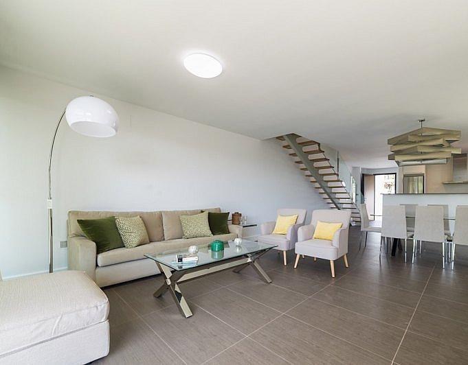 Puerta de seguridad, hall de entrada, salón / comedor con cocina moderna abierta totalmente equipada, desde esta planta se tienen acceso a la terraza cubierta, piscina y el jardín privado, aseo de invitados