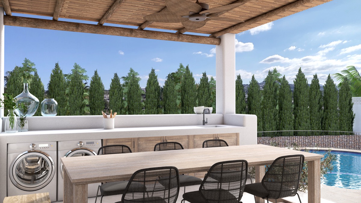 Planta baja: Salón comedor con cocina abierta con isla / barra, 1 dormitorio con baño en suite, 1 aseo, desde esta planta se tiene acceso a la terraza cubierta con cocina de verano y la piscina.