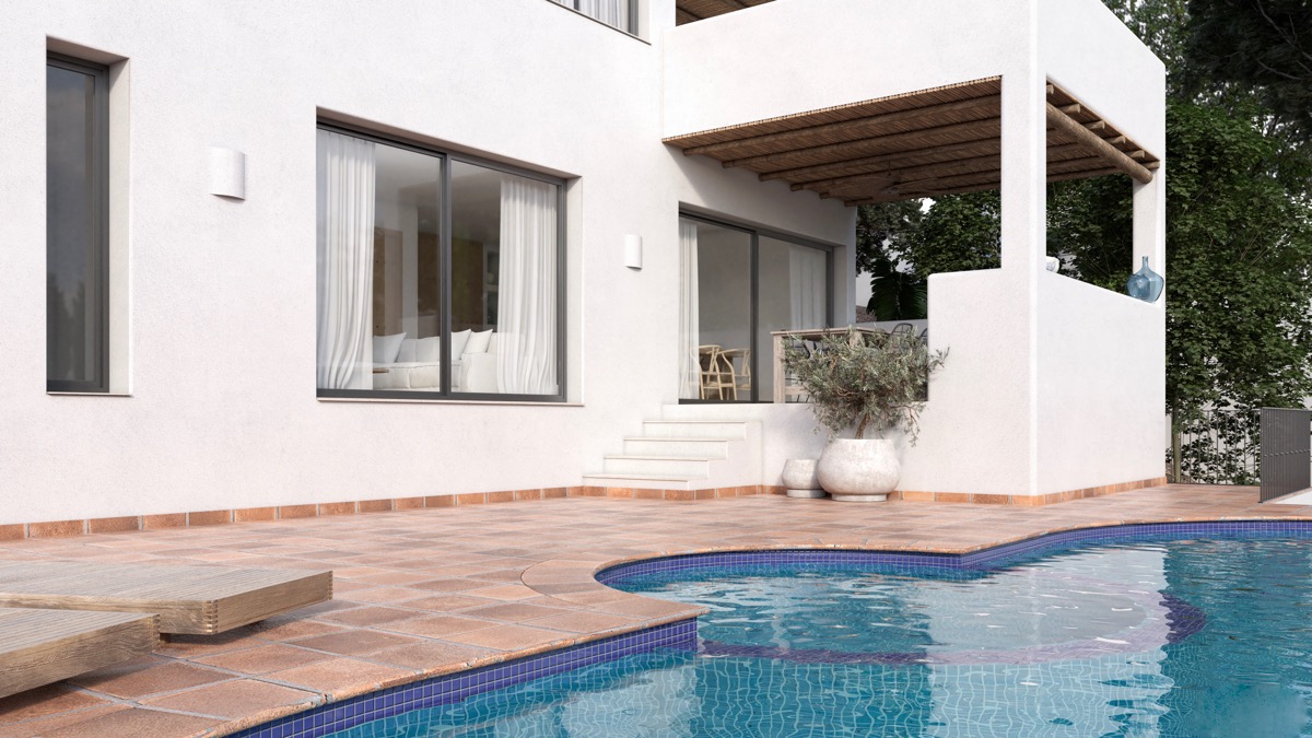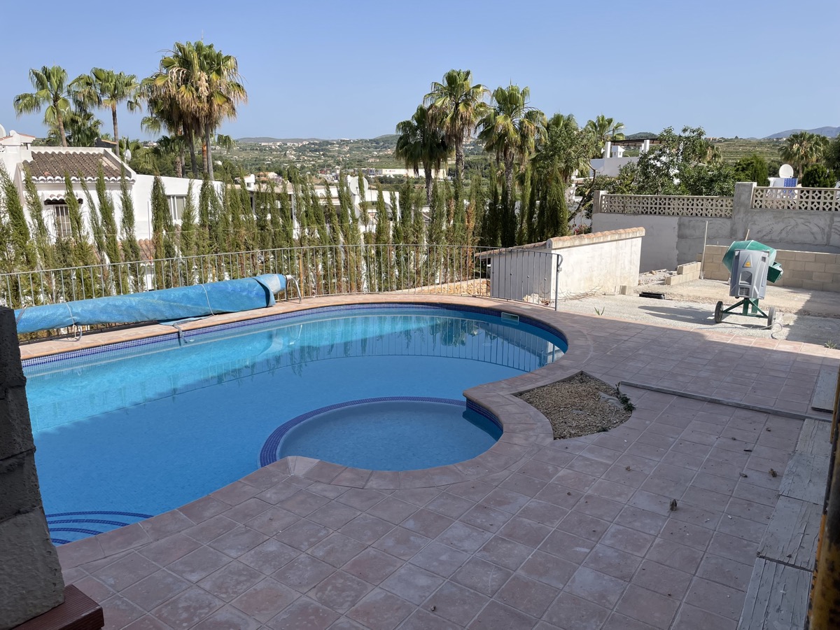 En construcción, fecha de finalizacion Septiembre 2022. Villa reformada estilo Ibiza en venta en Moraira, Paichi. Villa ubicada en parcela de 828 m2, con 168,89 m2 construidos distribuidos en dos plantas comunicadas por escalera interior, 3 dormitorios, 3 baños, 1 aseo, cocina interior, cocina de verano exterior, piscina privada de 9 x 4, terrazas cubiertas y descubiertas, sistema de calefaccion y climatizacion, amplia zona ajardinada y marquesina para 1 coche.