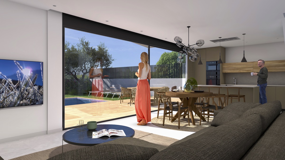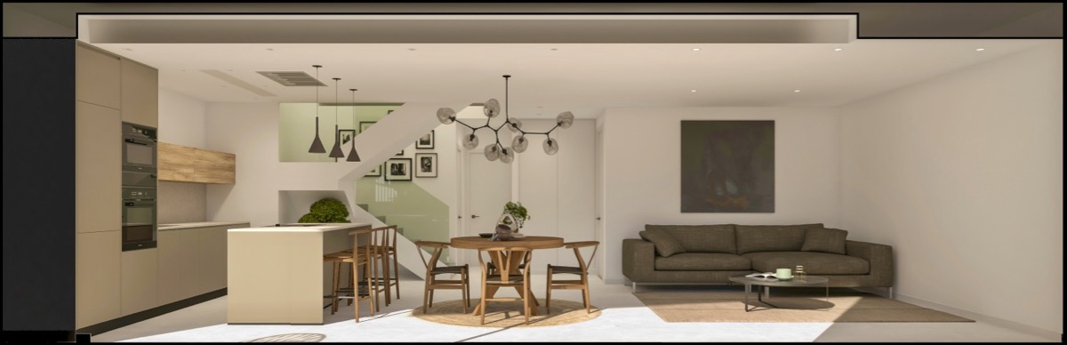 Planta baja: salon / comedor con cocina de planta abierta, lavadero y un dormitorio con baño en suite. Desde esta planta hay accesos a la terraza abierta con la piscina.