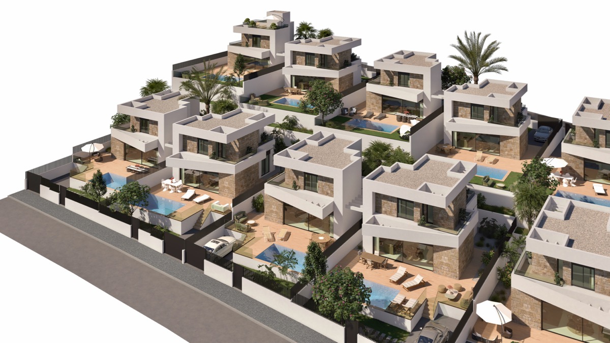 Directo del constructor, “Severiano Resort” Balcón de Finestrat desde 425.000€, nueva promoción de 19 exclusivas villas modernas de nueva construccion con vistas al Mar en Balcon de Finestrat en la Costa Blanca de Alicante, las villas constan de 116,90m2 construidos en parcelas desde 322 m2 y piscina privada de 19,90 m2 de lámina de agua, orientación sur / suroeste, distribuidas en 2 plantas con salón comedor con cocina moderna abierta, 3 dormitorios, 3 baños, lavadero independiente, terrazas…