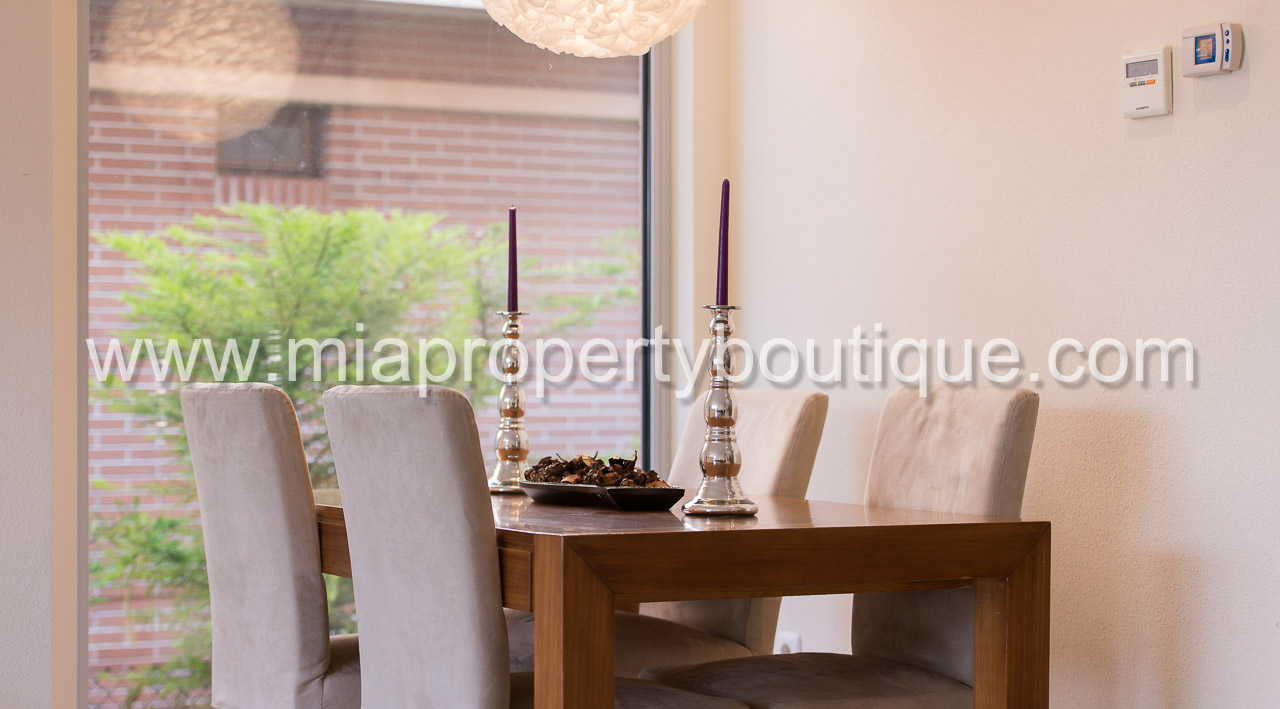 With pristine cream colour marble floor, this Immaculate home presents 4 bedrooms, all with fitted wardrobes; the master bedroom with its own en-suite plus two extra bathrooms for the rest of the family. There is also a guest lavatory on the ground floor. The lounge/diner is contemporary, light and airy with a chimney for those cool nights. From the livingroom there are views to the decked terrace and gardens through the double sliding glass doors. The house benefits from a fully fitted kitchen with separate utility room and there is space for a table. From the property entrance stairs lead down to the basement where we find a fantastic playroom measuring 50m2, a lavatory and double garage with electric door.